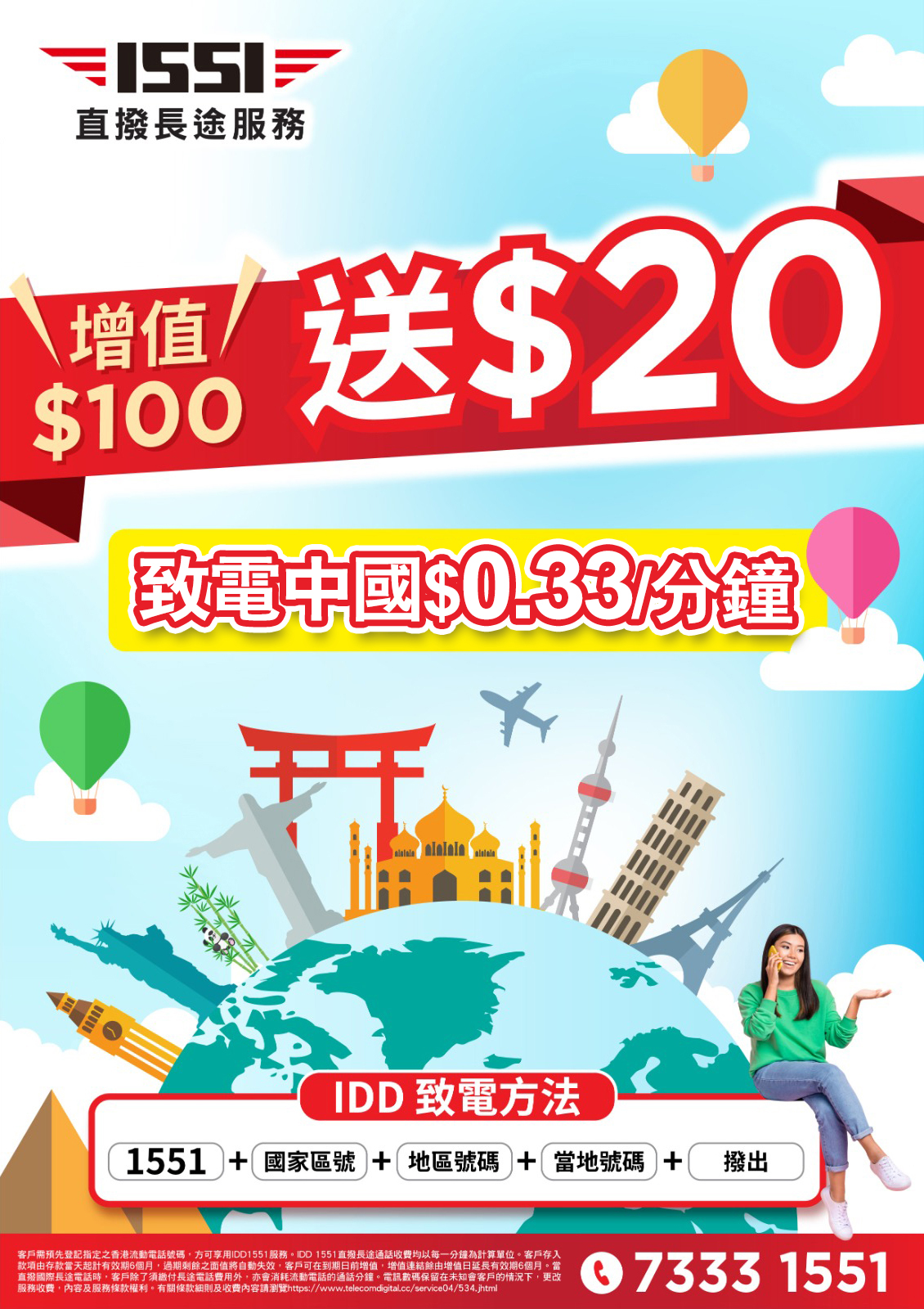 客戶只需預先登記指定之香港流動電話號碼,便可享用IDD1551服務,隨時隨地致電海外。IDD1551服務使用簡單方便,客戶只需使用已登記之香港電話輸入直撥接駁號碼“1551”,然後輸入國家區號、地區字頭及電話號碼,再按“打出”便可。 |